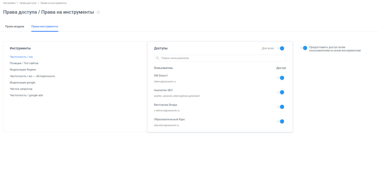 Раздел «Права на инструменты» состоит из 2 колонок. В левой части отображается список инструментов, которые есть в SEOWORK, и к которым можно применить изменения. В правой части список пользователей, которые относятся к проекту. С правой стороны от пользователя видно: есть ли доступ к инструменту или нет.