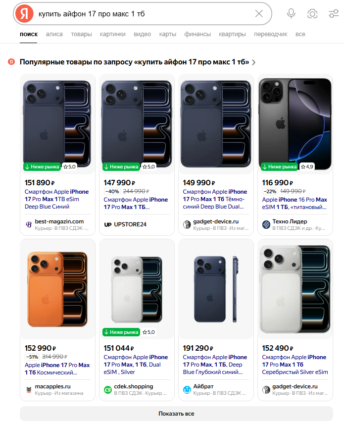 Поисковая выдача для E-commerce проектов не ограничена только классическими поисковыми сниппетами. Поисковая система Яндекс в ответ на товарные запросы показывает несколько органических товарных блоков, в том числе блоки: Популярные товары по запросам. В поисковой выдаче на один запрос часто встречается два блока Популярные товары.