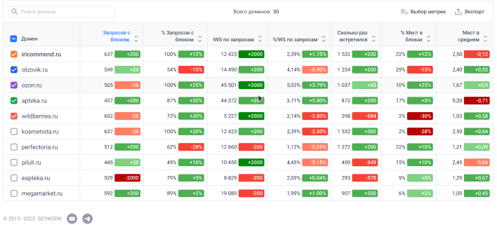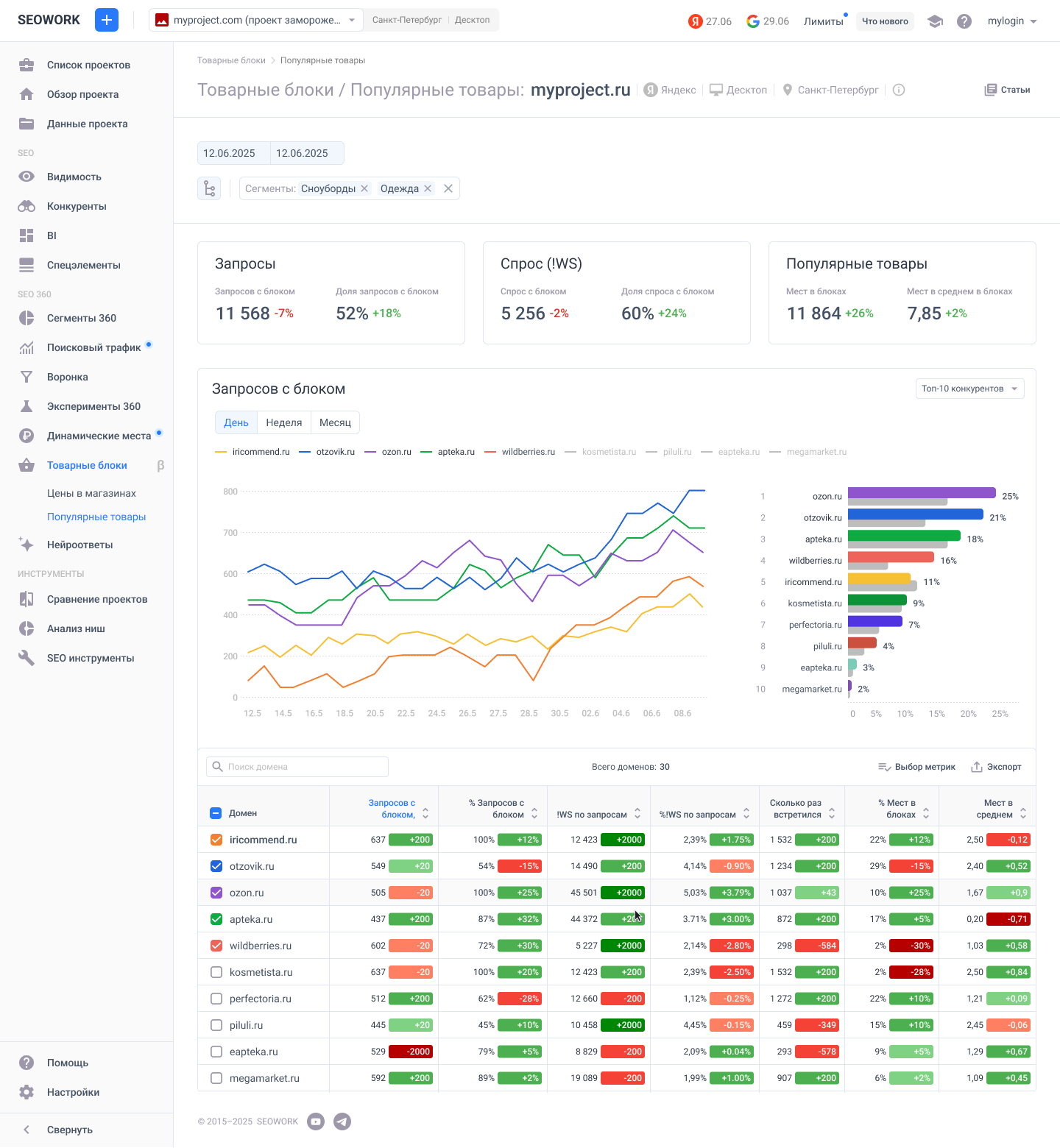 В зависимости от выбранного периода в календаре, график отражает показатели по домену проекта, который встречался в результатах поисковой выдачи в товарных блоках, а также показатели по конкурентам.