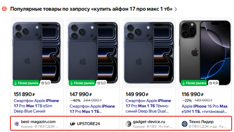 Как выглядят блоки Популярные товары по запросам в результатах поисковой выдачи Яндекс: