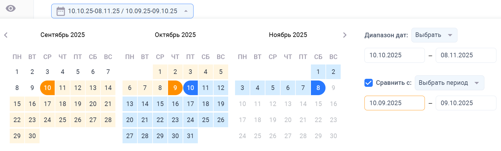 По умолчанию включён режим показа данных только за основной период, но при необходимости можно включить сравнение периодов.