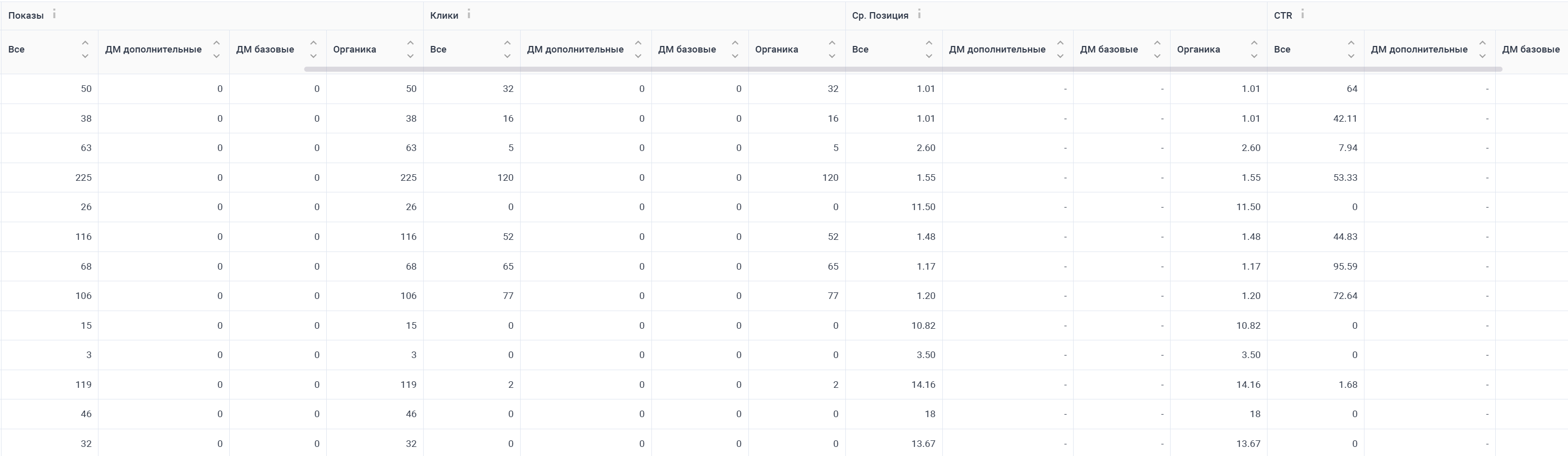 Показы, клики, средняя позиция и CTR имеют одинаковые колонки: